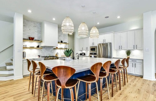 The open concept living areas and kitchen are perfect for groups of family, friends, or business travelers. Home cooks can stay close to all the action as they whip up a delicious dinner with stainless steel appliances and ample counter space. This home offers plenty of seating for you to gather in one of three living areas, for a meal in the kitchen or formal dining room, or out on the patio to enjoy the Texas weather. The kitchen island offers seating for 9 while the formal dining room can accommodate up to 12.