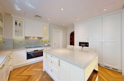 - Modern French-inspired closed kitchen elegantly designed with marble finishes and fully equipped with high-end appliances including stove, oven, toaster, kettle, fridge, built-in microwave and dishwasher