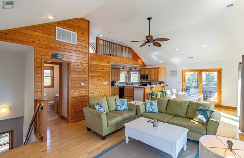 Main Level: Queen en suite with a tub and shower combo, a flat screen TV, and a sliding door to the mid-level deck. Queen bedroom with a flat screen TV, pyramid bunk bedroom with a flat screen TV (DVDs only). Both bedrooms have access to a hall bathroom with a shower and access to a second screened deck.