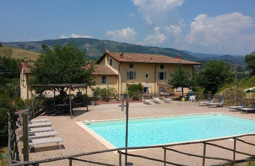 This holiday farmhouse is part of a wine estate, located between Florence and Lucca, at 1 km from the village of Masotti and is surrounded by a luxuriant countryside with vineyards and olive groves. The owners’ family farmhouse and a small farmer’s house have recently been renovated and converted into apartments for holiday rentals. They consist in 4 flats in the main house plus a romantic cottage in a detached building. At guests disposal a swimming pool (12x6 m, open Jun-Sept), washing machine, internet Wi-Fi connection and barbecue for al fresco dining. The estate’s owners organize wine and olive oil tastings for those interested.The nearest shops, restaurants and train station are in the village at 1 km.Lucca is at 37 km, Florence 41 km, Pisa 51 km, the Versilia coast at 60 km, while the relaxing spa town of Montecatini is a just 10 km. An ideal position for those wishing to spend a quiet vacation in the countryside and for those who have cultural and art interests.
