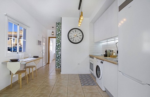 The apartment occupies the ground floor, has independent access, and is located in a very quiet residential area close to the beach. There is a bus stop nearby, but it is recommended to use a private car for sightseeing. The nearby area offers a golf course, a McDonald's, a mall, a supermarket, a cinema, and a pharmacy. Local highlights include La Guirra and Castillo sand beaches, Caleta de Fuste natural volcanic pool, a promenade, and Salinas del Carmen Museum showcasing the history and culture of salt production on the island.