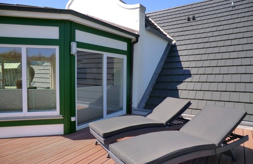The modern newly equipped and bright apartment has 3 bedrooms (1x with double bed and 2 x 2 single beds), 1 living room with spacious dining area and open kitchen, 1 sauna, and two shower rooms. A W-LAN connection is available free of charge. Features of the penthouse include: 2 balconies, a large roof terrace, 3 satellite SMART TVs, X-BoX 360 with small game selection, DVD Blue Ray Player, underfloor heating, washing machine and an elevator in the house.