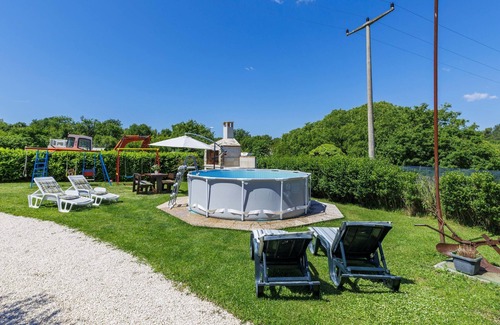 Semi-detached house "Cekić". 300 m from the centre of Sosići, 11 km from the centre of Rovinj, 26 km from the centre of Poreč, 11 km from the sea. For shared use: property 400 m2 with lawn and trees, swimming pool round (3,5 m diameter, depth 140 cm, seasonal availability: 01.May. - 01.Oct.). Garden furniture, barbecue (swing). In the house: internet access. Parking (for 3 cars) on the premises. Shop 1.5 km, supermarket 3 km, bus stop 200 m, pebble beach 11 km. Marina 11 km.