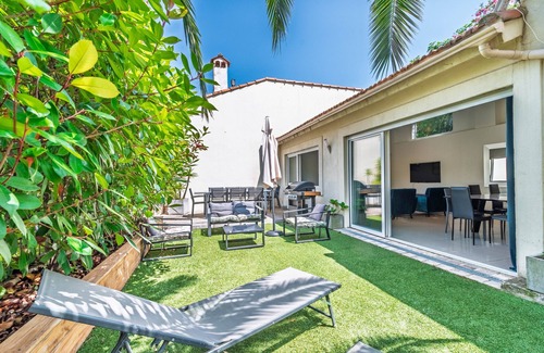 Large city-style loft house, quiet in the city with a very large terrace surrounded by Mediterranean vegetation and a second terrace with a small pool. Modern air-conditioned interior with 4 bedrooms, each with a shower or bathroom.At the end of the dead-end street, you arrive via the terrace which includes an area with outdoor sofas and then a dining area with a barbecue. Through French windows, you access the interior, a very large living room and loft-style kitchen, overlooking the terrace. A long corridor with two bedrooms on the left, each with its own shower - the first with a shower area and a 160 cm bed, the second larger with a bathroom and toilet and a 180 cm bed, these two bedrooms open onto the corridor through large glazed panels with blackout curtains.From this corridor, a few steps to the right lead to a bedroom with two separate beds and three windows overlooking the exterior, with a bathroom including a bathtub and toilet.A few steps higher on the right is a terrace with a small pool approximately 3x2 meters, as well as a closet with the washing machine. On the opposite side, you access the large suite overlooking the back with a very large bedroom, 180 cm bed, sofa bed area, dressing room and bathroom with bathtub and shower. Separate toilet.The entire house is air-conditioned and bedrooms are individually air-conditioned.10 minutes walking from the city center, the Palais des Festivals, and the sea.10 minutes from highway access, 30 minutes from Nice Côte d'Azur International Airport.
