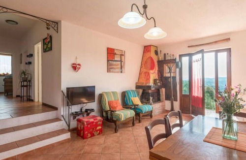 "Valmarinella", 4-room house 86 m2, on the upper ground floor. Practical furnishings: living/dining room with open-hearth fireplace, dining table, satellite TV and heating stove. Exit to the terrace. 1 room with 1 sofabed and 1 double bed. 1 room with 1 double bed and 1 fold-away bed. 1 small room 5 m2 with 1 bed. Open kitchen (mini-oven, dishwasher, Gas stove, 4 gas rings, toaster, microwave, electric coffee machine). Bath/bidet/WC, shower/bidet/WC. Gas heating, wood heating. Balcony, patio roofed. Barbecue, deck chairs. Beautiful panoramic view of the countryside. Facilities: washing machine, baby cot. Internet (WiFi, free). Please note: non-smokers only. Maximum 3 pets/ dogs allowed.