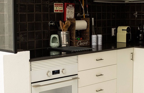 Full kitchen equipped with fridge with freezer, electric hob, oven, microwave, dishwasher, coffee machine (Nespresso), kettle, toaster, crockery, cutlery, and kitchen utensils.