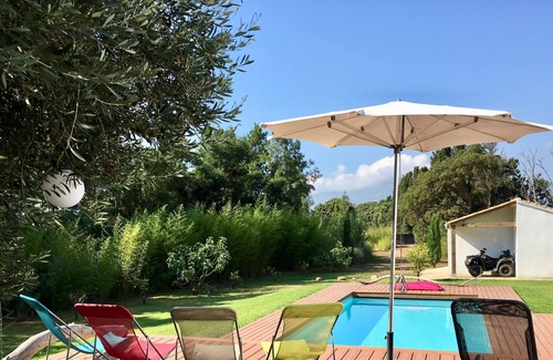 45 minutes from Bastia airport, on the road to Porto-Vecchio, we leave the hustle and bustle of certain parts of the coast of the island to discover a rare property. At the end of a landscaped dirt road, in an almost intact natural setting, hides a completely renovated house, from which it is not necessary to choose between the swimming pool or direct access to one of the beaches of uncrowded sand on the east coast of the island.