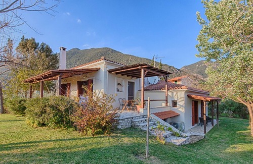 Our beautiful family villa is situated between 2 small picturesque villages, Skaloma and Marathias, both of which can be reached on foot in 15 minutes. It is a newly built house, adhering to the main traditional architecture of the region. It is located just 250m away from a beautiful pebble beach that can be reached in 3 minutes on foot, and it is quiet even during August. The house offers a pleasant, comfortable and peaceful stay. The covered terrace overlooks a large garden, the sea and the mountains of the Peloponnese.