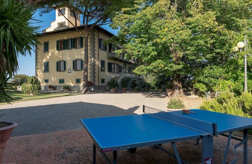 Villa Beltrami is surrounded by a beautiful park, enhanced by large areas of lawn bordered by hedges to guard your privacy, all surrounded by vast expanses of olives and vineyards that will frame your unforgettable holidays. In the large garden shaded by centuries-old pines and cedars of Lebanon, you will be met by an explosion of colourful flowers, by lemons typical of the area and a corner dedicated to herbs that you can use to create the typical dishes of Tuscan cuisine. Within the park are numerous shady areas where you can just relax. On the beautiful panoramic terrace is a large table where you can take outdoor meals, while the area between the house and swimming pool is provided with sofas and armchairs under the shade of a gazebo.Please notice that photos are taken in spring, therefore flower blossoming, and the colours of the gardens' grass could be different at the moment of your arrival at the villa.