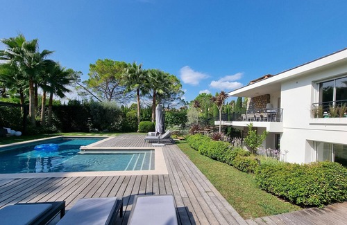 Blue Villa of Mougins Luxury villa with heated swimming pool in Mougins near CannesMeet Villa Bleu de Mougins, an elegant and luxurious holiday villa located in a quiet, residential neighborhood of Mougins the art and gastronomic pearl just behind Cannes. This exclusive residence offers a beautifully landscaped garden, stylish pavilions, a heatable private swimming pool with built-in lounge benches, and a refined interior for a holiday in complete comfort. Outdoor Living and RelaxationSubtropical garden with atmospheric evening lightingHeated private swimming pool with shallow entry and lounge benches in the waterLarge sun terrace with comfortable sun loungers and parasolsTwo stylish pavilions with louvered roof: one for dining, one for lounging. Outdoor shower, sink and refrigerator between the pavilionsPrivate terrace adjacent to the master bedroom Interior comfortCentral air conditioning throughout the entire villaStylishly decorated living room with sliding doors to the balconyLarge smart TV, soundbar, Blu-ray player, PlayStation 3 and Apple iPod dockModern open kitchen with cooking island and dining table for 12 peopleAmerican refrigerator with ice maker and second refrigerator-freezer combination in the garageTwo Nespresso machines with milk frotherWiFi available throughout the villa and in the garden Bedrooms BathroomsVilla Bleu de Mougins has 6 comfortable bedrooms and 5 modern bathrooms.- All boxspring beds measure 90 x 200 cm and can be made up both as a double bed and as two separate beds.- Ground Floor. Bedroom 1: two beds (90x200 cm), en-suite bathroom with toilet. Bedroom 2: two beds (90x200 cm), en-suite bathroom with toilet. Bedroom 3: two beds (90x200 cm), en-suite bathroom with toilet- Garden level. Bedroom 4 (master): two beds (90x200 cm), ensuite bathroom with toilet, access to private terrace. Bedroom 5: two beds (90x200 cm), ensuite bathroom with toilet, access to two terraces. Bedroom 6: two beds (90x200 cm), separate bathroom in the hallwayExtra separate toilet available LocationLocated in a luxury residential neighborhood in MouginsOnly 7.5 km from La Croisette and the beach of Cannes. Within short distance of renowned golf courses, including: Royal Mougins Golf Club (5 min drive) Golf Country Club of Cannes-Mougins (10 min drive) Golf de Saint-Donat (15 min drive)Art galleries, gourmet restaurants and charming villages in the vicinityDay trip possibilities to Cannes, Antibes, Grasse and Nice