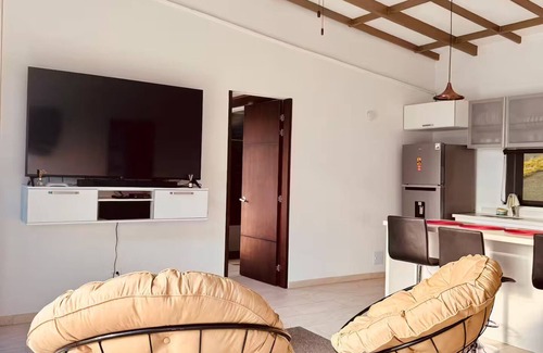 Cuenta con 2 habitaciones con baño privado con agua caliente, sala, comedor y cocina totalmente equipada, TV LED de 70".