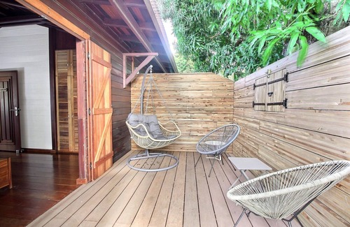 Our 5 red wooden holiday villas and our cabin in the mango tree have been designed for your comfort and your privacy. In addition to access to the infinity pool, each of the 5 villas has a private spa, a fully equipped kitchen, quality bedding, outdoor spaces (flowered terraces, deckchairs, barbecue) and a private swimming pool for the Désirable villa.