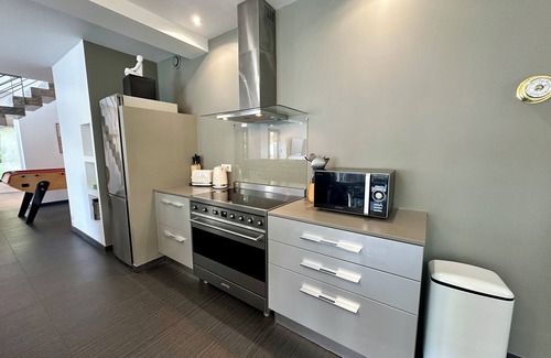 A large open room directly overlooks the pool, it offers a large TV lounge, a large equipped kitchen with dining area and a table football.