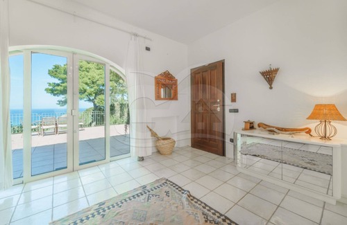 On the first floor, large living room with terrace overlooking the sea, equipped open kitchen, outdoor kitchen equipped with wood-burning oven, barbecue, gas grill, dishwasher, washing machine and table and chairs for outdoor dining.