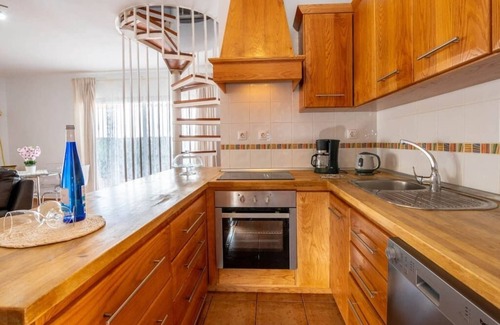Detached villa located in Residencial Sueño Azul with 3 bedrooms, 2 bathrooms, living room, open concept kitchen and large terrace. The property has 1 bedroom with double bed en suite with bathroom and safe, a second bedroom with double bed, a third bedroom with a single bed, a second bathroom, fully equipped kitchen with various appliances, living room with flat screen TV with satellite channels in various languages, wifi, security alarm, terrace with large Jacuzzi for 5 people, sun loungers, table, garden sofa and barbecue. The house has a private solarium on the top with views of the mountains, the sea and the sunset, it is perfect for sunbathing on the sun loungers with parasol.