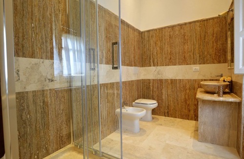 Here guests will find a large outdoor pool, covered in travertine, to relax after a walk in the sculpture park or in the various paths departing from the villa. Around the large pool area there is a patio with sun loungers, from where you can admire the estate all around. A few steps from here you find the CALIDARIUM, swimming pool with hot water (38°) covered by vault arches with a large solarium with umbrellas and sunbeds. There is also a bathroom with shower.