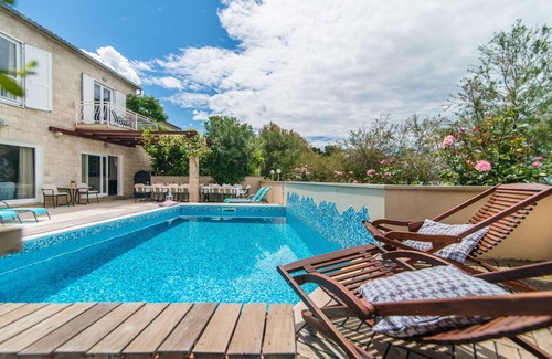 Villa Mirca can accommodate 14 to 17 persons in 7 bedrooms, 4 of which are located on the sea side of the house offering sea views right from the beds! Open space ground floor features a big living and dining room, kitchen, laundry, a small gym with some devices for workout and a pool table room for fun. Terrace and 28 m2 heated swimming pool are positioned only few meters from the sea. On the terrace is also an outside dining area in the shade of pergola and oleander trees, and a number of deck chairs around the swimming pool. In the back yard is another roofed patio with table tennis and a big grill. Villa Mirca has parking place for 3 cars and high level of the equipment and service: wireless internet, safe, cable TV, air conditioning, every day cleaning and towels change, linen change 2x a week, concierge and excellent chef service on request.