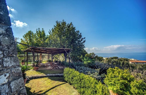 Villa Monticello is a Rustic Countryside Retreat with Stunning Views of Capri and the Mediterranean sea. Set amidst the serene hills of Massa Lubrense, Villa Monticello is a unique countryside heaven that offers panoramic views of the Mediterranean Sea and the captivating Capri Island. With its classic stone architecture, earth-toned decor, and luxurious outdoor areas, Villa Monticello provides a charming blend of rustic Italian style and modern comforts, perfect for those seeking a quiet escape. At Villa Monticello, each moment is crafted for lasting memories. Gather with friends and family to prepare authentic Italian pizza and bake it in a traditional wood-fired oven, embracing the flavors and heritage of Italian cuisine. Step onto the private, lush grass field for a friendly game of soccer or relax under the shade of ancient olive trees, serenaded by the soft sounds of cicadas. Lounge on comfortable outdoor seating nestled within a flourishing Mediterranean garden, or unwind by the exquisite pool, basking in the sun's warmth with views that inspire. The main building has two floors, featuring both spacious indoor living areas and beautifully landscaped outdoor spaces. Ground Floor with Living and Dining Area: upon entering, guests are welcomed by a large living spaces with rustic country-style furnishings, comfortable sofas, and a traditional kitchen. This area also includes a single bedroom and a charming dining space, where family and friends can gather in a warm, inviting ambiance. First Floor accessible by a staircase, the first floor houses one elegantly appointed double bedroom and a single bedroom, each featuring rustic decor and antique Italian furniture. In addition to these rooms, there is a flexible space with two single beds and a sofa bed, offering ample accommodations for families or larger groups. The garden Suite exudes a cozy rustic charm, with a comfortable living area complete with a sofa bed, fireplace and a fully equipped kitchen. A staircase leads to two additional double bedrooms, one featuring two single beds, perfect for guests seeking additional privacy and a touch of countryside comfort. The villa's layout, with its spacious indoor living areas and beautifully landscaped outdoor spaces, seems to cater to both intimate gatherings and larger groups. The Villa spans two floors, blending spacious interiors with beautifully designed outdoor areas to create a seamless living experience. At ground Floor you enter into a spacious, inviting rooms adorned with rustic country-style decor, comfortable sofas, and a fully equipped, traditional kitchen. A cozy single bedroom and charming dining area invite guests to savor intimate meals and quality time in an enchanting setting. Accessed via a staircase, the first floor features an elegantly appointed double bedroom, a single bedroom, and a flexible space with two single beds and a sofa bed, creating an ideal setup for families or larger groups. Garden Suite features a cozy living area, sofa bed, fireplace, and fully equipped kitchen, is perfect for guests seeking extra privacy. Two additional double bedrooms (one with two single beds) provide a peaceful retreat amidst rustic comforts. Outdoor Spaces: Villa Monticello’s outdoor spaces are thoughtfully arranged to offer privacy, tranquility, and the full enjoyment of the Mediterranean landscape. Terraces and Patio: The villa’s furnished terraces open to scenic views of the Mediterranean Sea and Capri, creating ideal spaces for outdoor dining or relaxing under the sun. Swimming Pool and Sunbathing Area: Centered in a garden filled with century-old olive trees, the 60-square-meter private pool is surrounded by sun loungers and an expansive lawn, providing a serene space for swimming and sunbathing.