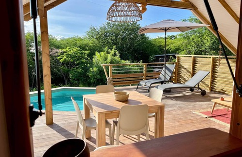 Nestled between the lush mountains of Basse-Terre and the blue Caribbean Sea, the Caribbean Shelter cottage consists of six small, fully equipped, 4-star villas that can accommodate between 2 and 4 people, each with a private pool.