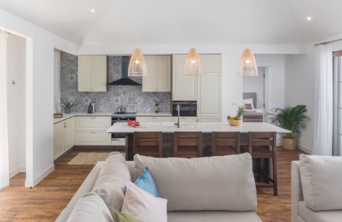 The villa consists of a living room, a large kitchen island with sink that also serves as a dining table with room for 4 people and a modern kitchen unit where you will find everything you need to prepare a light breakfast or mediterranean lunch. What makes the villa stand out is the choice of material and the interior design, which suggest luxury at every step of the way.