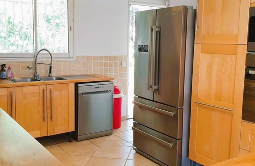 La cuisine ouverte sur le séjour invite à des moments de convivialité pendant les repas. Elle est entièrement équipée et possède un cellier attenant avec lave-linge et le nécessaire pour l'entretien de la villa.