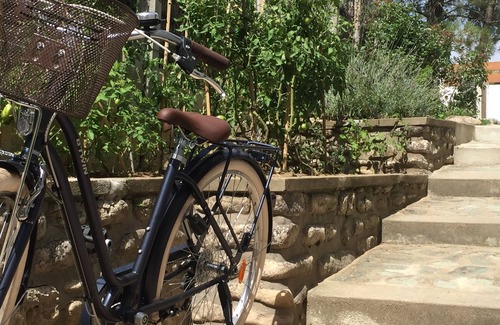 Sunny terrace and garden, facing south, equipped with a dining and relaxation area under the shade of pine trees. Squirrels and birds are often our hosts.