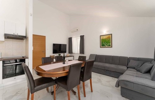 Constructed in 2011, this semi-detached holiday house is furnished with modern furniture. The property features a closed yard of 100 sqm,with a smaller indoor swimming pool with hydromassage, a summer kitchen, a roof terrace with sunbeds, and parking space for two cars.
