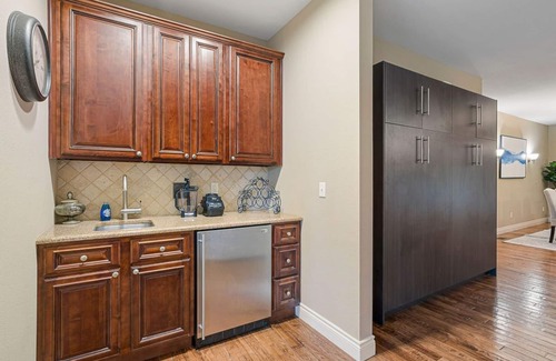 The fully equipped kitchen has everything you need to prepare meals at home, including stainless steel appliances, granite countertops, a coffee maker, and plenty of cookware and utensils. There’s a breakfast bar for quick snacks and a dining table where everyone can enjoy meals together. Just off the kitchen is a convenient wet bar and a dedicated game area that adds a little fun to your evenings in.