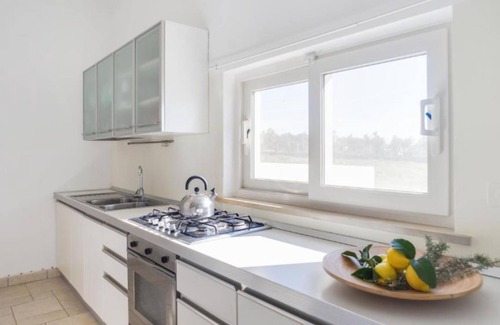 The entrance opens onto a large, tastefully furnished living room, where traditional elements and contemporary lines coexist in perfect balance. The kitchen, large and fully equipped, invites you to convivial moments, with everything you need to prepare and share typical Salento dishes.