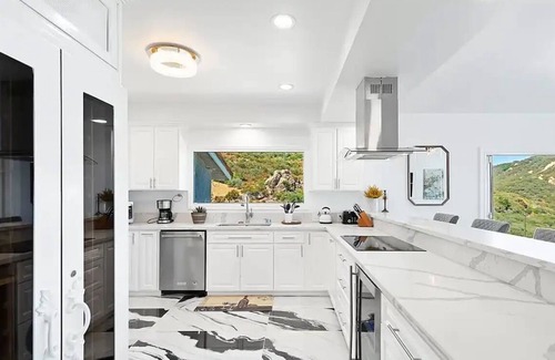 This stunning home is freshly remodeled and located in the prime Malibu hillside. Panoramic 360 views of the Ocean, Malibu mountains, and our charming on site vineyard. Relax above the clouds with one of our brand new amenities including an 8 person outdoor spa, 5 big screen TVs, Karaoke, a gazebo yoga space/gym at the bottom of the vineyard, gourmet kitchen, fire pit, and grill. This family friendly space is an unmatched getaway for anyone wanting to relax and unwind.