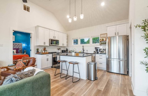 Inside, this modern two-bedroom, two-bathroom home offers elevated comfort with stylish touches throughout. The teal primary suite features a king bed dressed in bamboo sheets, velvet quilts, and plush down-filled pillows, creating a cocoon-like calm for ultimate relaxation. The emerald bedroom offers bold yet inviting sophistication with a queen bed layered in rich textiles, cognac leather, and jewel-toned accents. Natural wood, stone-inspired details, and brass touches tie both spaces back to the rugged beauty of the Hill Country, ensuring every corner feels elevated yet authentic.