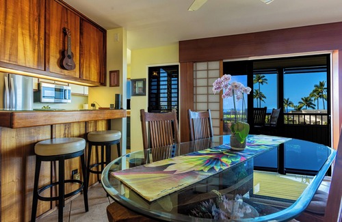 Introducing the newest unit in our portfolio! Please visit and be our first review with an introductory Special Rate till August 31th! Wailea Ekolu #405 is an ocean view 2 bedroom, 2 bath ground floor unit with air conditioning throughout, a fully equipped kitchen, washer and dryer, 1 flat screen TVs, and wireless Internet.. In the master bedroom is a queen bed, A/C, ceiling fan, and full bathroom. Bedroom 2 queen murphy bed, A/C, and ceiling fan. There is a/c in the living room, a ceiling fan, flat screen TV, and Blu-ray / DVD player. Also enjoy meals on the ocean view lanai! For outdoor activities, Wailea Ekolu #405 is equipped with beach chairs, and beach towels. BBQ grills are not allowed on individual unit lanais in compliance with fire code restrictions. Community grilling stations are available. Sleeps 4.
