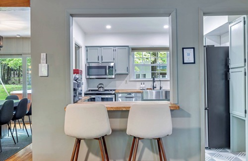 The main living area offers plenty of stylish yet cozy seating for your entire group to enjoy the fireplace. The kitchen is stocked with a drip coffee maker, Keurig, French press, a popcorn machine, and stainless steel appliances, all for your convenience to whip up meals to enjoy in the dining room together.