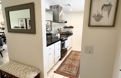 This updated 1 bedroom 1 bathroom home feels like a boutique luxury hotel with the comforts of home. The living room area with its vaulted cathedral ceiling also has a view of the 18th green and has a cool mid-century vibe. The home includes a full, well equipped kitchen to cook your best recipes and includes stainless steel appliances and pantry. Tile floor throughout living room, kitchen and bathroom. The home has all new fresh paint throughout.