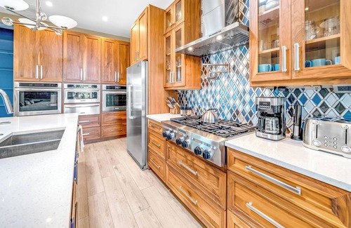 KITCHEN- This kitchen includes a Quartz top island with bar stools, a large beautiful dining table and chairs, Bar top with stools, all new stainless steel appliances which include the following: Dishwasher, fridge & freezer, Mini Fridge (Wine Cooler) microwave, oven, and stove. This kitchen offers all cooking necessities such as silverware, dishes, pots and pans, glass cups, wine glasses & champagne glasses. Also includes a toaster, Keurig coffee maker, tea maker, blender, barbecue utensils, all commonly used condiments, and all cooking basics! Truly one of a kind kitchen set up!