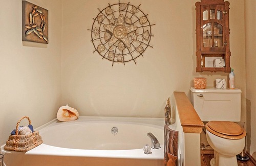 Small families or a pair of couples will find plenty to love at this waterfront home. It comes complete with a walkway down to a pebbly beach, great outdoor space under shady trees, and a front deck for barbecues or taking in a majestic sunrise Islands views.