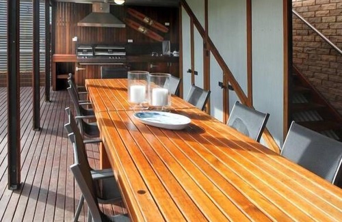 The big outside deck facing the river, can comfortably accommodate large groups, with an undercover outside kitchen, built in 6 burner BBQ, commercial drinks fridge, outdoor furniture and flat screen tv. FREE WIFI