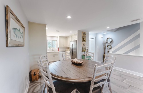 The first floor has an updated kitchen and 1/2 bath. It also houses the dining and living room areas. Step out onto the porch with dining table and chairs and listen to the waves while grilling that fish you caught just steps from where you stand.