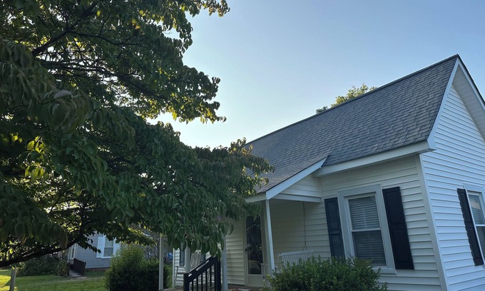 r game nights. The updated bathroom is modern and sleek, featuring stylish fixtures and all the essentials for a comfortable stay. Outside, a welcoming front porch awaits with a cozy swing and rocking chairs, ideal for enjoying a morning coffee or a quiet evening. For those needing to get a little work done, a dedicated workspace is tucked away in a quiet corner, providing a functional area with a desk, chair, and good lighting. Finally, a small music-themed nook adds a playful touch to the space, with decor featuring musical instruments, notes, and perhaps even a record player for guests to enjoy. This unique home offers a perfect blend of functionality, charm, and style for a memorable stay.