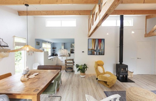 The spacious living room has a high ceiling and a modern, warm appearance. A wood stove provides extra coziness, but you need to supply the wood yourself. Furthermore, the living room is equipped with a flatscreen smart TV.