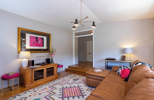 This Central Sedona retreat is a beautifully remodeled 2-bed 2-bath home, complete with Mid-Century Modern touches and a turntable and vinyl collection for guests. Amazing access to all Sedona has to offer — galleries, boutiques and restaurants. Walk to Sunset Park and trails. Fully stocked including grill.