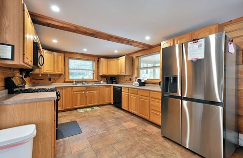 The spacious log cabin with four bedrooms and two baths offers room for family and friends to comfortably gather. The open-concept kitchen, living room, and dining area with a cozy wood stove create a warm and inviting atmosphere.