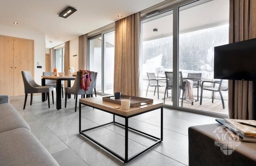 The Alhéna MGM residence***** (classification in progress) is located in the resort of Flaine Forum in Haute-Savoie. This ski-in, south-facing residence features contemporary architecture with noble materials. The apartments have beautiful openings extended by large balconies overlooking the surrounding mountains. To enhance your daily life, the residence offers a restaurant, an ESF nursery, a lounge with fireplace and a lounge bar, a wellness area with swimming pool, sauna, hammam and jacuzzi and a Spa Montagnes du Monde®. The first ski lifts are 50 m away, the shops and the ski school are 100 m away. Surface area : about 50 m². View ski slopes. Living room with bed-settee. Bedroom with safe, double bed. Kitchen with kettle, coffee machine (filtre), Wine cellar, oven / microwave, toaster, dishwasher, 2 induction cooking rings. Bathroom with bath-tub, hairdryer, towel-dryer. Separated WC. Balcony with garden table and chair.