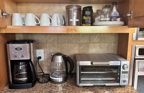 • A chef-ready kitchen awaits, thoughtfully stocked with all the essentials for home-cooked meals.