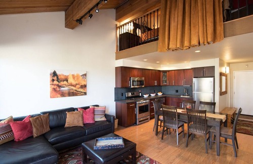 This recently renovated 2 bedroom, 2 bath condo has a queen bed in one room, and a double bed in the other. The living room features a gas fireplace and comfy leather sofa where you can relax after a great day on the slopes or trails. Guests can also step out onto the private deck to enjoy gorgeous surrounding scenery. The kitchen is fully equipped and wireless internet access is provided.