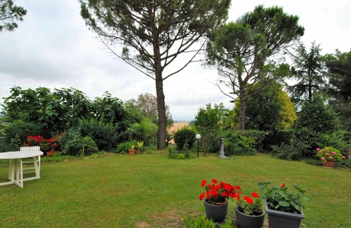 "Maria Rosaria" is a rustic two-story detached cottage surrounded by trees in Pesaro, Italy. It offers a spacious 3,800 square meter fenced garden with a lawn, trees, garden furniture, and a barbecue area. The property provides internet Wi-Fi and parking on the premises. While enjoying your vacation rental in the countryside, you can take advantage of amenities such as the yard, internet Wi-Fi, and parking.