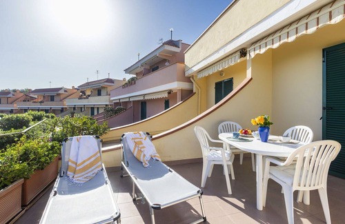 The apartment is well-equipped with modern amenities to ensure a convenient and enjoyable stay. It includes a washing machine, iron, hair dryer, and free WiFi internet access. The kitchen is fully-furnished with an oven, four gas rings, a kettle, freezer, an electric coffee machine, and Lavazza coffee capsules. Outside, you can enjoy the large 25-square-meter terrace with furniture and deck chairs, offering a breathtaking panoramic view of the sea and the resort. Additionally, reserved parking is available for your convenience.