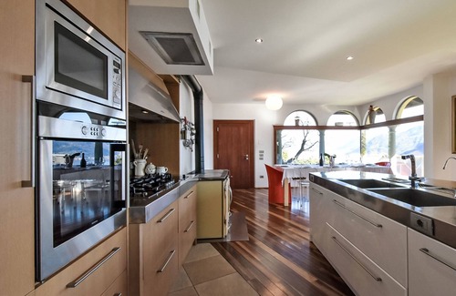 5-room apartment 280 m2 on 1st floor, south-east facing position. Spacious and bright, modern and stylish furnishings: large living/dining room with sliding door, panoramic window with Scandinavian wood stove (only for decoration), dining table and TV. Exit to the terrace. Living/sleeping room with panoramic window with 1 double sofabed (130 cm, length 180 cm). 1 room with 1 bed (80 cm, length 180 cm), 1 double bed (160 cm, length 180 cm), bath/bidet/WC. 1 room with 1 french bed (130 cm, length 190 cm), shower/bidet/WC. 1 large room with panoramic window with 1 french bed (120 cm, length 190 cm), shower/bidet/WC. Large kitchenette (oven, dishwasher, 6 gas rings, toaster, kettle, freezer, electric coffee machine, Capsules for coffee machine (Nespresso) free, cooking island, combination microwave) with double hand-basin. Bathroom. Parquet floors. Large terrace roofed, garden. Terrace furniture. Very beautiful panoramic view of the lake and the mountains. Facilities: washing machine, children's high chair, baby cot, hair dryer. Internet (WiFi, free). Please note: suitable for families. Non-smokers only. Maximum 1 pet/ dog allowed. Private entrance. IT016102C24LDAHOO9