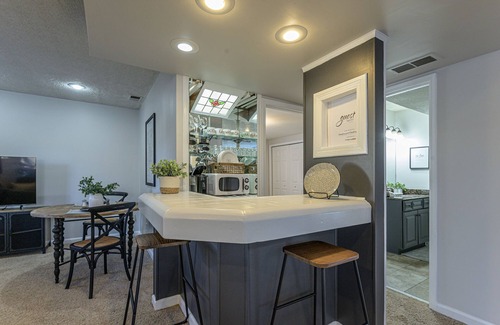 If you’re traveling with a large group you’ll be thankful for the three full bathrooms in this home. The first bathroom is connected to the upstairs master bedroom. The second bathroom is also upstairs and features a tub/shower combo, hotel-quality towels, and a beautiful vanity with wall mirrors. The third bathroom is downstairs and has a garden tub with dual shower heads. All bathrooms have a wall mounted hair dryer.