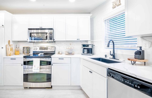 The fully equipped kitchen features top-of-the-line stainless steel appliances, stunning quartz countertops and backsplash, and all the coffee-making essentials to start your day off right. But that's not all - with decks, docks, and flip flops at your disposal, you can make the most of your time in this beautiful vacation home.